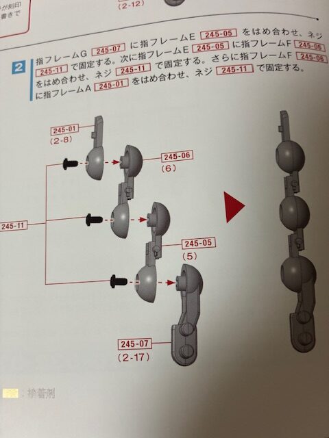 指フレームG 245-07に指フレームE 245-05をはめ合わせ、ネジ245-11で固定する。次に指フレームE 245-05に指フレームF 245-06をはめ合わせ、ネジ245-11で固定する。さらに指フレームF 245-06に指フレームA 245-01をはめ合わせ、ネジ245-11で固定する。