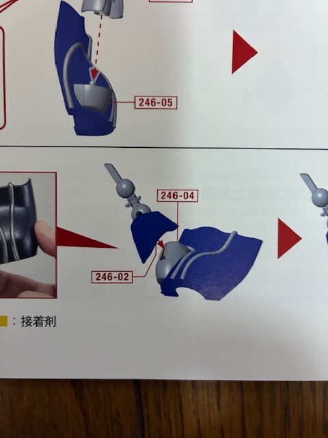 第244号のSTEP01で組み立てた親指の指フレームB 244-02の凸部に多用途接着剤を少量塗り、親指B 246-02にはめ込んで接着する。