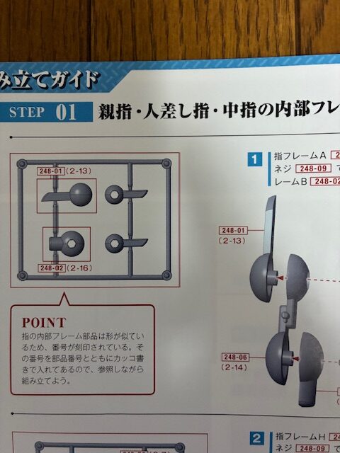 POINT 指の内部フレーム部品は形状がにているため、番号が刻印されている。その番号を部品番号とともにカッコ書きで入れてあるので、参照しながら組み立てよう。