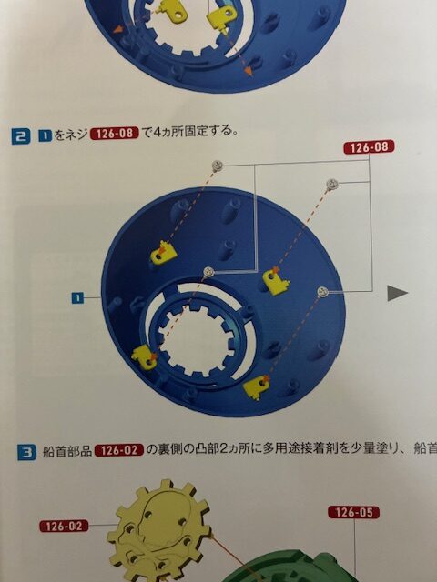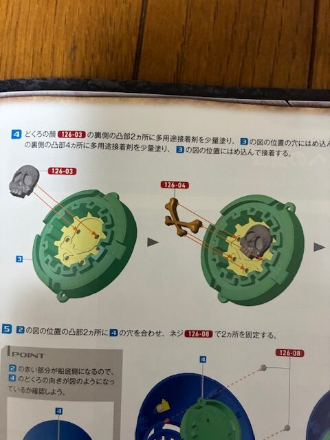 ドクロの顔126-03の裏側の凸部2ヵ所に多用途接着剤を少量塗り、図の位置の穴にはめ込んで接着する。ドクロの骨126-04の裏側の凸部4ヵ所に多用途接着剤を少量塗り、図の位置にはめ込んで接着する。