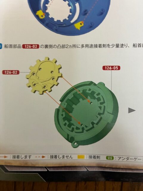 艦首部品126-02の裏側の凸部2ヵ所に多用途接着剤を少量塗り、艦首部品126-05にはめ込んで接着する。