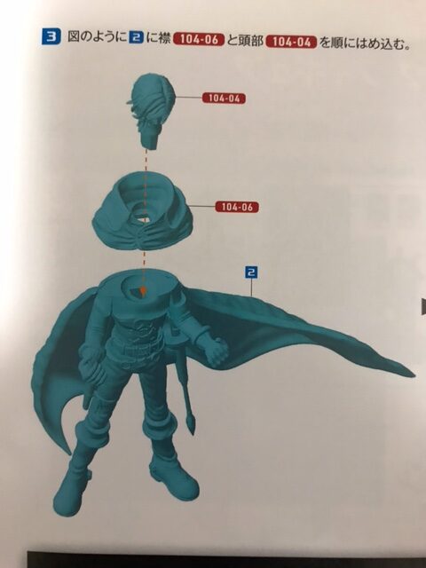 図のように襟104-06と頭部104-04を順にはめ込む。