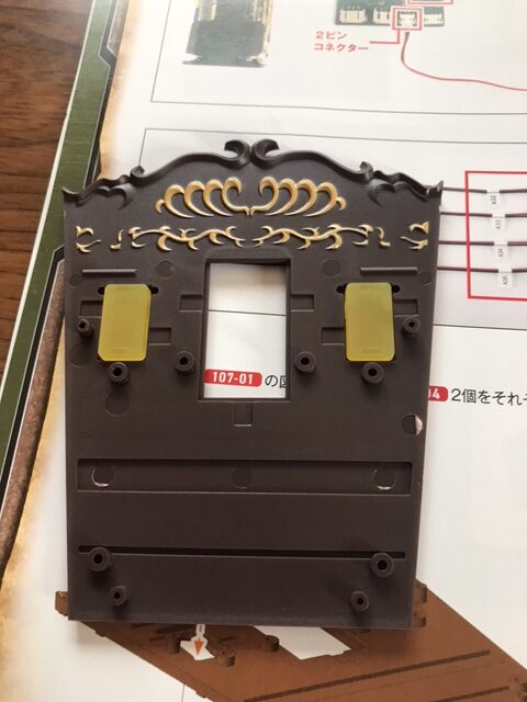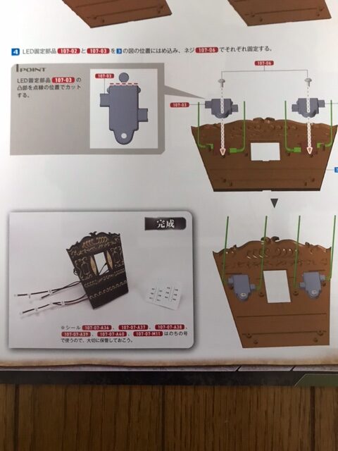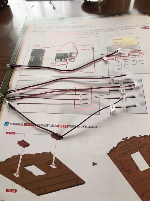 船尾楼の背面を組み立てる。LEDを固定する際に、ネジをしっかり締めてLEDが抜けないようにしようとの記述がある。