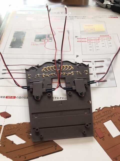 第2号付属のバッテリーボックス002-05に単三乾電池4本を入れ、第2号付属のテスト基板002-06の電源用コネクターに接続する。テスト基板002-06の2ピンコネクターにLED 107-05 4本をs1本ずつ接続して点灯を確認したら、第98号付属のシール098-09-A32と、シール107-07-A33、107-07-A34、107-07-A35をそれぞれ貼る。