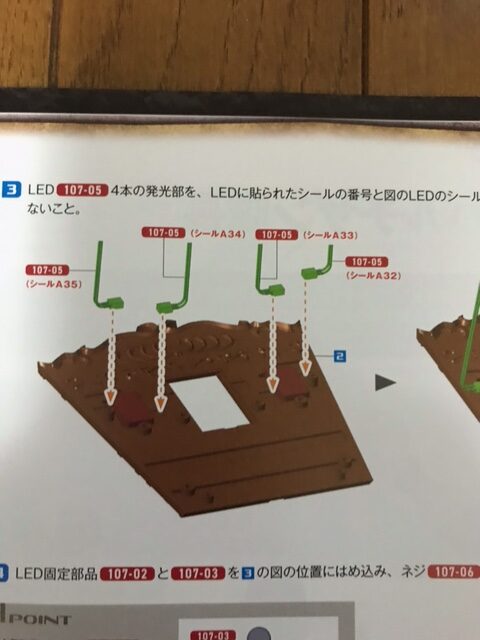 LED 107-05 4本の発光部を、LEDに貼られたシールの番号と図のLEDのシール番号を合わせて凹部にセットする。強く折り曲げないこと。