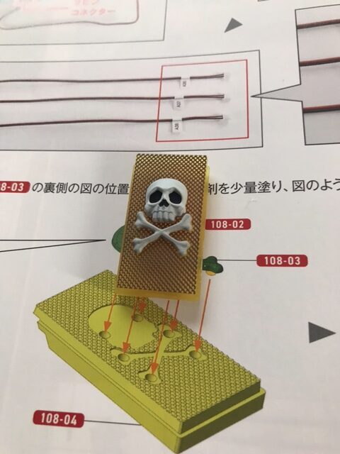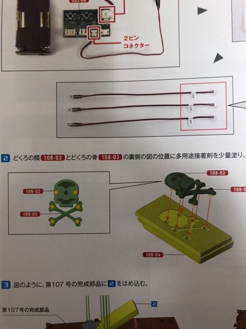 どくろの顔108-02とどくろの骨108-03の裏側の図の位置に多用途接着剤を少量塗り、図のように船窓108-04にはめ込んで接着する。