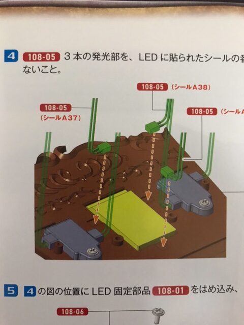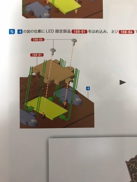 図の位置にLED固定部品108-01をはめ込み、ネジ108-06で2ヵ所を固定する。