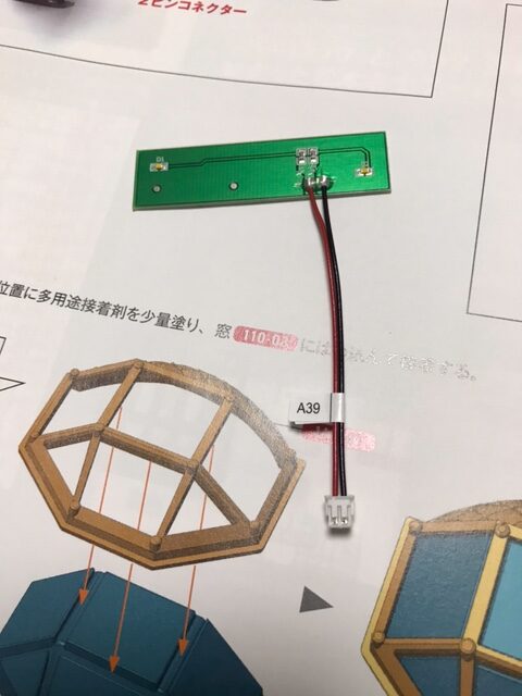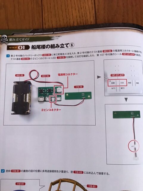 第2号付属のバッテリーボックス002-05に単三乾電池4本を入れ、、第2号付属のテスト基板002-06の電源用コネクターに接続する。テスト基板002-06の2ピンコネクターにLED 110-10を接続して点灯を確認したら、第107号付属のシール107-07-A039を貼る。