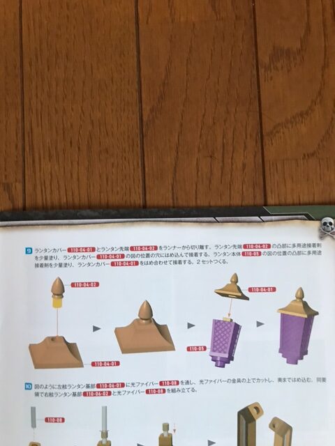 ランタンカバー110-04-01とランタン先端110-04-02をランナーから切り離す。ランタン先端110-04-02の凸部に多用途接着剤を少量塗り、ランタンカバー110-04-01の図の位置の穴にはめ込んで接着する。ランタン本体110-05の図の位置の凸部に多用途接着剤を少量塗り、ランタンカバー110-04-01をはめ込んで接着する。2セット作る。