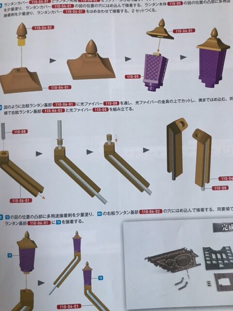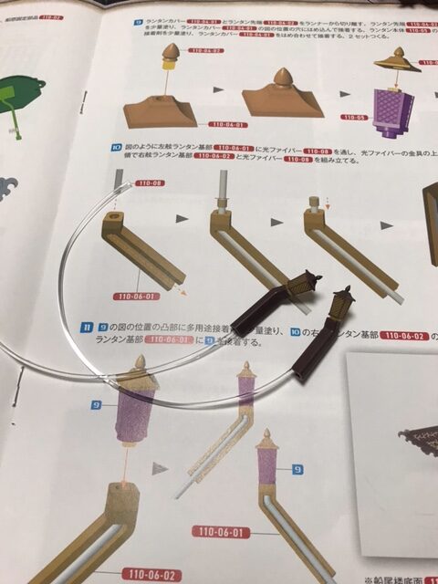 図のように左舷ランタン基部110-06-01に光ファイバー110-08を通して、光ファイバーの金具の上でカットし、奥まではめ込む。同要領で右舷ランタン基部110-06-02と光ファイバー110-08を組み立てる。