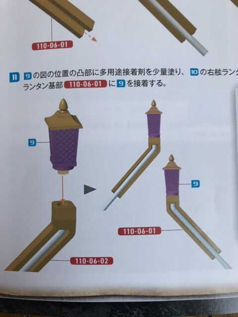 図の位置の凸部に多用途接着剤を少量塗り、右舷ランタン基部110-06-02の穴にはめ込んで接着する。同要領で左舷ランタン基部110-06-01に接着する。