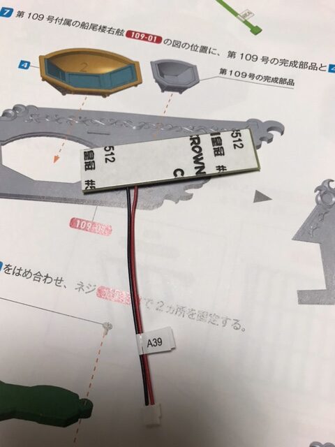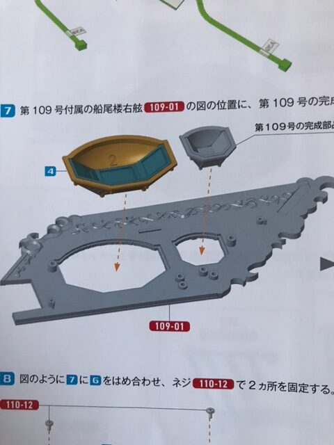 109号の付属の船尾楼右舷109-01の図の位置に、第109号完成部品とはめ込む。