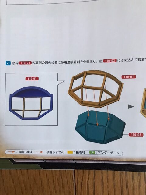 窓枠110-01の裏側の図の位置に多用途接着剤を少量塗り、窓110-03にはめ込んで接着する。