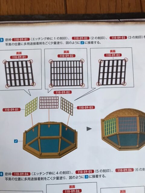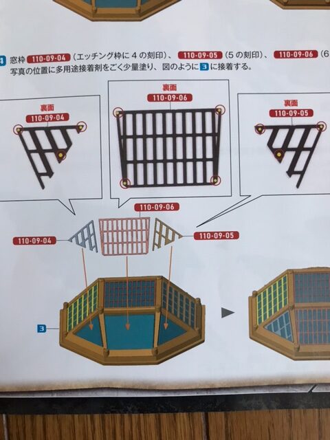 窓枠110-09-04(エッチング枠に4の刻印)、110-09-05(5の刻印)、110-09-06(6の刻印)をエッチング枠から切り離して、写真の位置に多用途接着剤を少量塗り、図のように接着する。