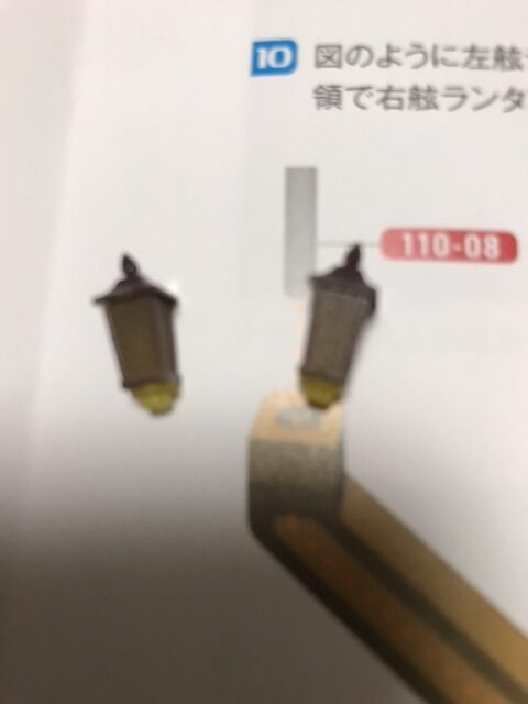 船尾楼の右舷側と後端のランタンを組み立てる。ランタンは小さな部品を接続するので、適宜ピンセットやつまようじを使っていこうとの記述がある。