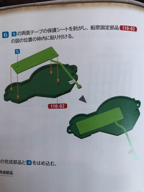 両面テープの保護シートを剝がし、船窓固定部品110-02の図の位置の窓枠に貼り付ける。