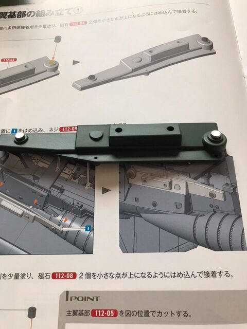 主翼基部112-04の図の位置に多用途接着剤を少量塗り、磁石112-08 2個を小さな点が上になるようにはめ込んで接着する。