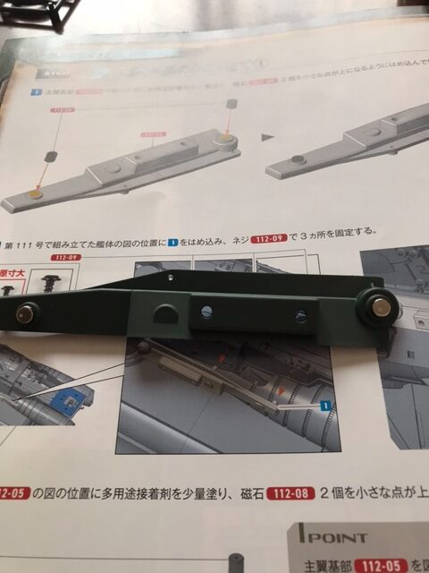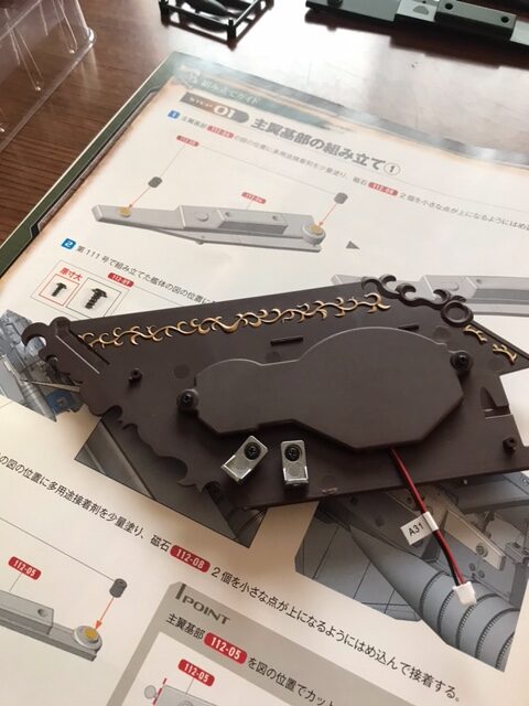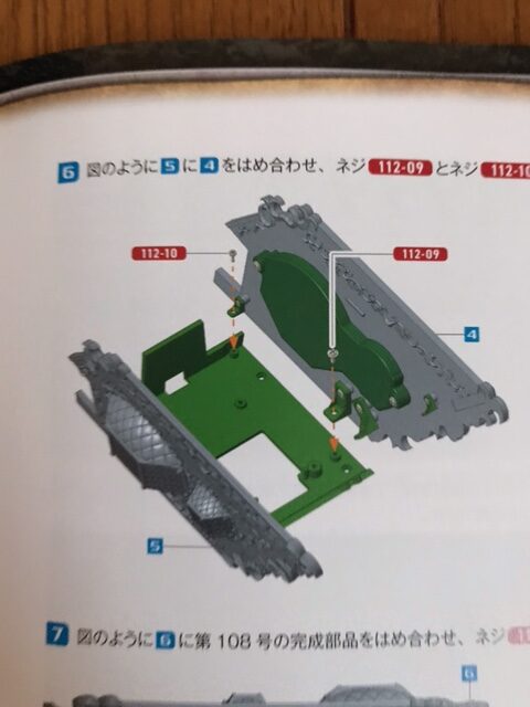 図のように第108号の完成部品をはめ合わせ、ネジ112-09とネジ112-10で固定する。
