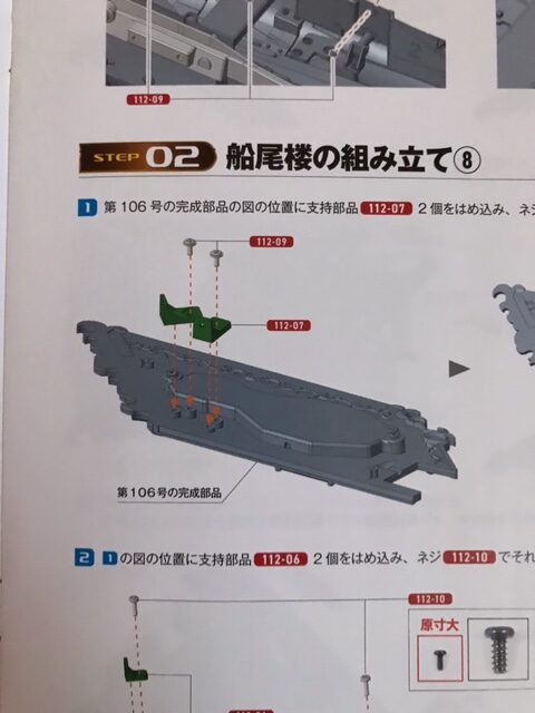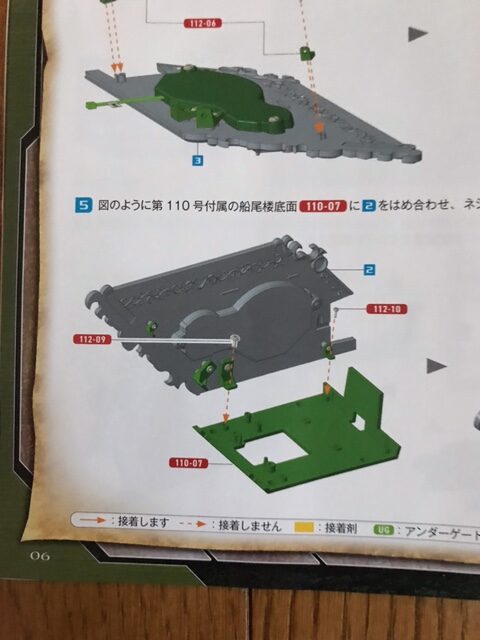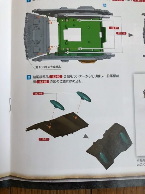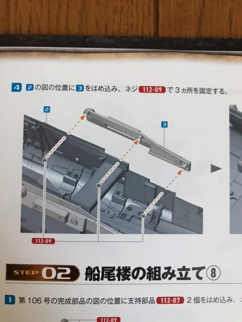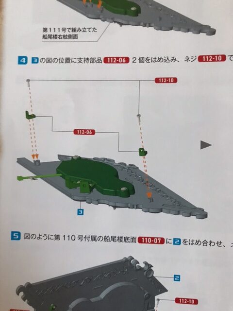 図のように第110号付属の船尾楼底面110-07にはめ合わせ、ネジ112-09とネジ112-10で固定する。