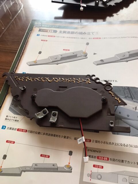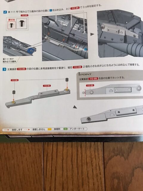 主翼基部112-05の図の位置に多用途接着剤を少量塗り、磁石112-08 2個を小さな点が上になるようにはめ込んで接着する。