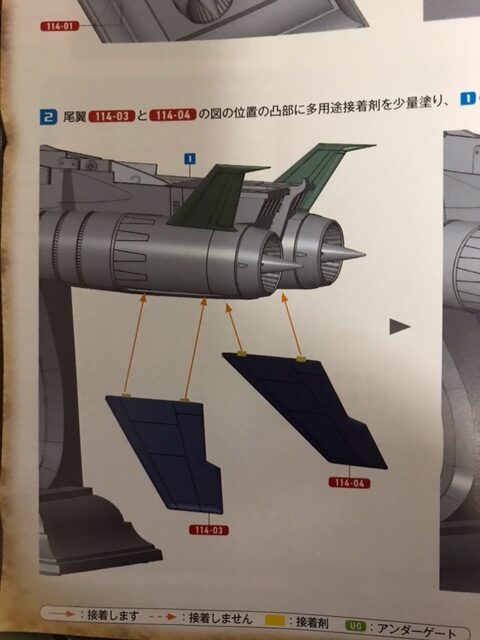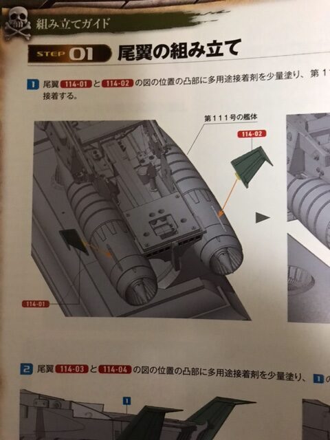 尾翼114-01と114-02の図の位置に多用途接着剤を少量塗り、第111号で組み立てた艦体の図の位置の凹部にはめ込んで接着する。