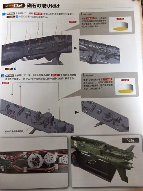 エンジンに4枚の尾翼を取り付けるを行った。あとは艦体に磁石の取り付けを行うことで今号の作業は終了となった。全体的に作業量は少なめといっていいだろう。