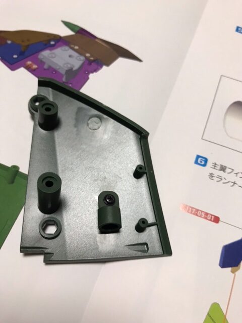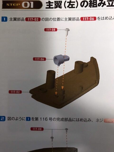 主翼部品117-01の図の位置に主翼部品117-06をはめ込み、ネジ117-08で固定する。