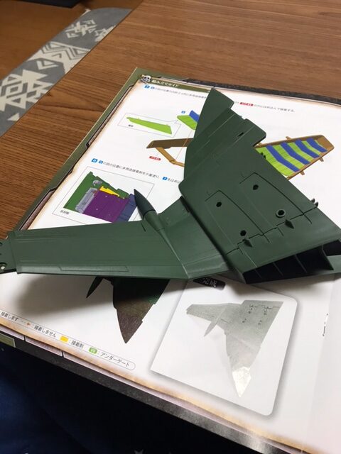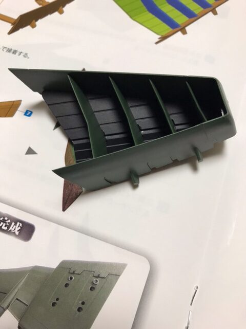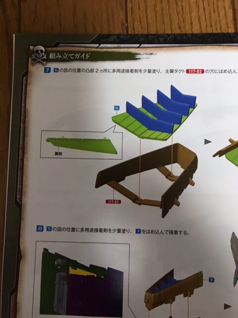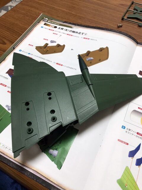 引き続き主翼の組み立てを行う。主翼基部のフィンを組み立てる際には、向きを間違えないように注意しようとの記述がある。