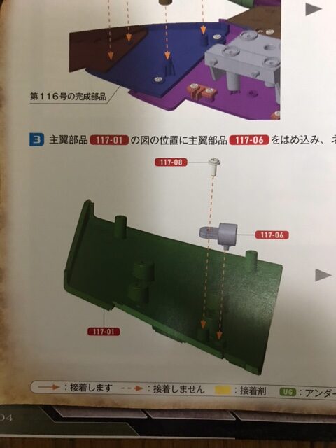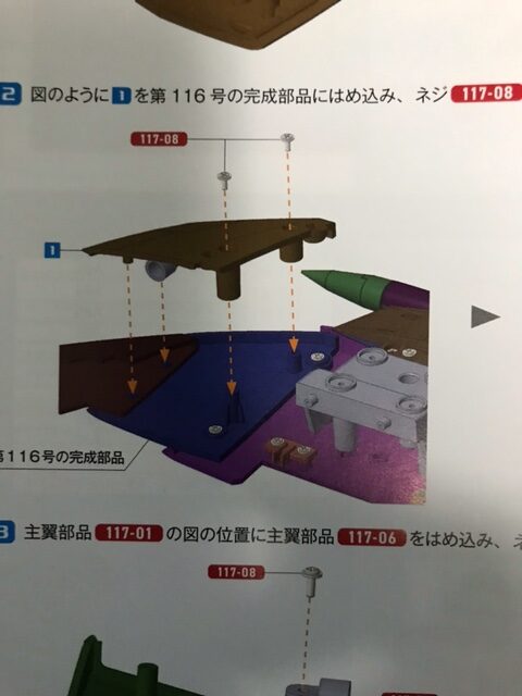 主翼部品117-02の図の位置に主翼部品117-06をはめ込み、ネジ117-08で固定する。