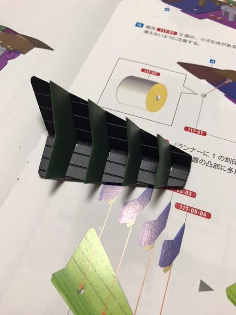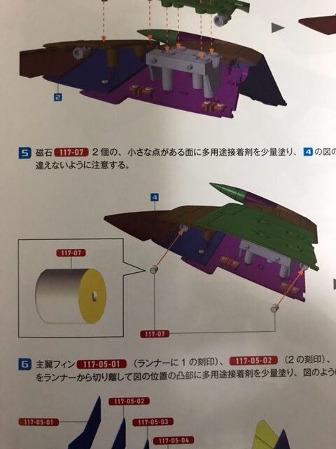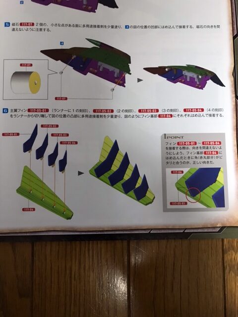 主翼フィン117-05-01(ランナーに1の刻印)、117-05-02(2の刻印)、117-05-03(3の刻印)、117-05-04(4の刻印)をランナーから切り離して図の位置の凸部に多用途接着剤を少量塗り、図のようにフィン基部117-04にそれぞれはめ込んで接着する。