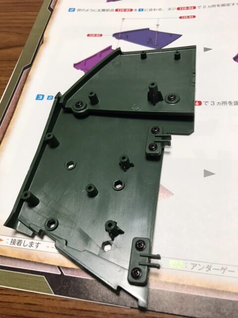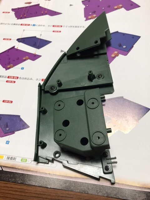主翼(右)の基部の組み立てる。主翼(左)同様大きな部品同士を組み合わせるので、ネジをしっかりと締めようとの記述がある。