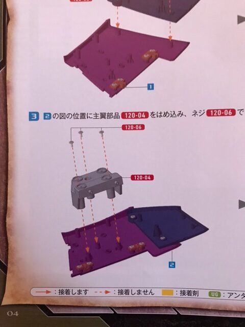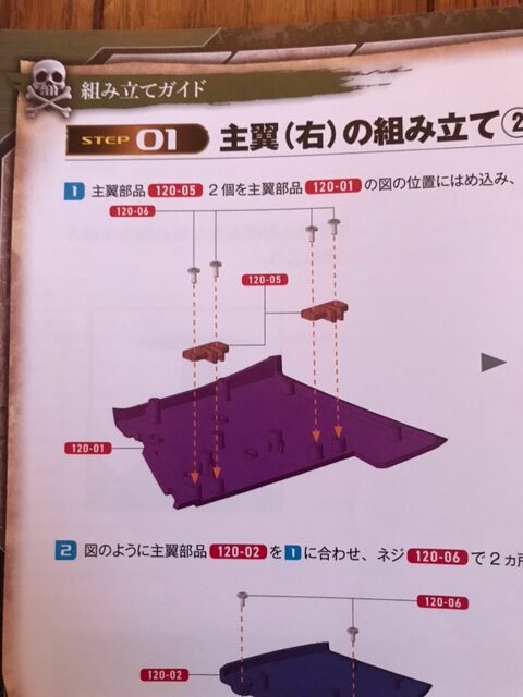 図のように主翼部品120-02を合わせ、ネジ120-06で2ヵ所を固定する。