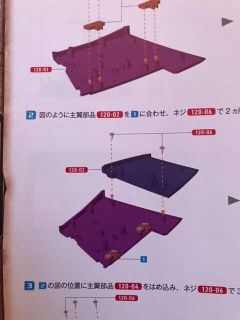 主翼部品120-05 2個を主翼部品120-01の図の位置にはめ込み、それぞれネジ120-06で2ヵ所を固定する。