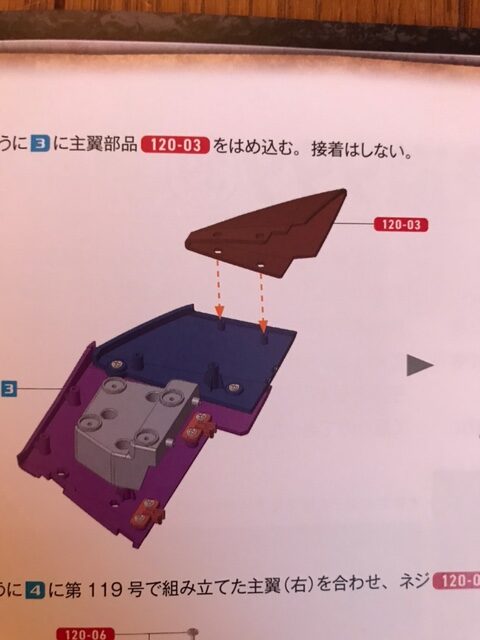 図のように主翼部品120-03をはめ込み。接着はしない。