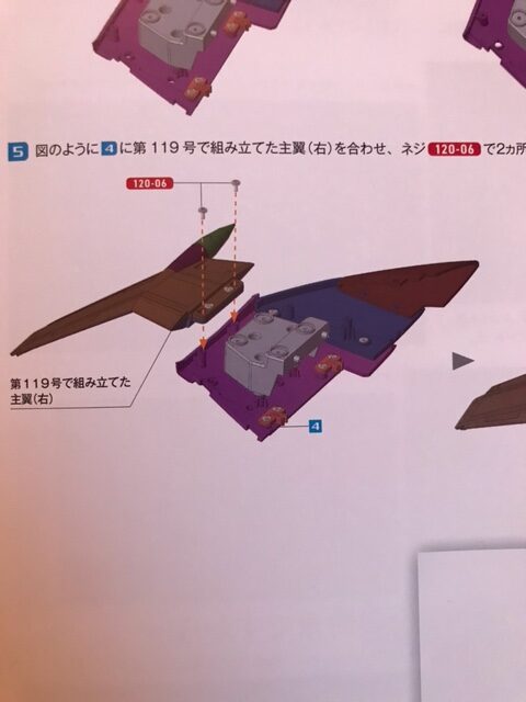 図のように第119号で組み立てた主翼(右)を合わせ、ネジ120-06で2ヵ所を固定する。
