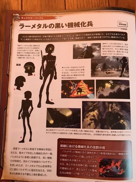 「さよなら銀河鉄道999」の中盤の舞台となるラーメタル星には、数タイプの機械化兵がとうじょうした。なかでも生身のパルチザンと戦闘する機会がもっとも多かったのがここで紹介する黒い機械化兵で、複数で鉄郎を襲うがのちに殲滅されている。