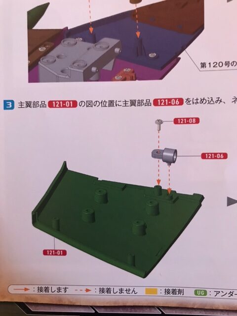 主翼部品121-01の図の位置に主翼部品121-06をはめ込み、ネジ121-08で固定する。