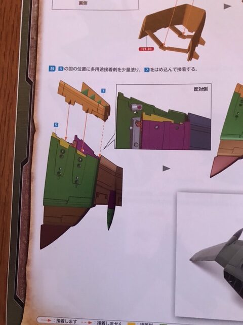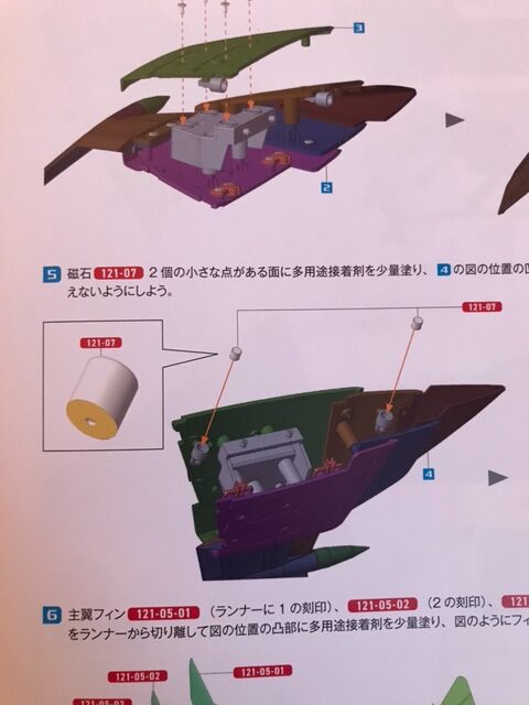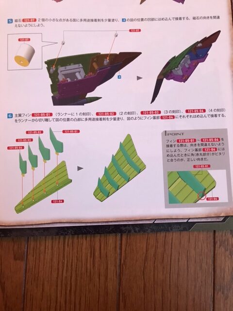 主翼フィン121-05-01(ランナー1の刻印)、121-05-02(2の刻印)、121-05-03(3の刻印)、121-05-04(4の刻印)をランナーから切り離して図の位置の凸部に多用途接着剤を少量塗り、図のようにフィン基部121-04にそれぞれはめ込んで接着する。