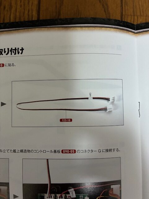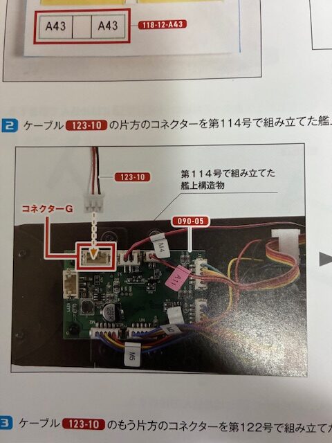 ケーブル123-10の片方のコネクターを第114号で組み立てた艦上構造物のコントロール基板090-05のコネクターGに接続する。