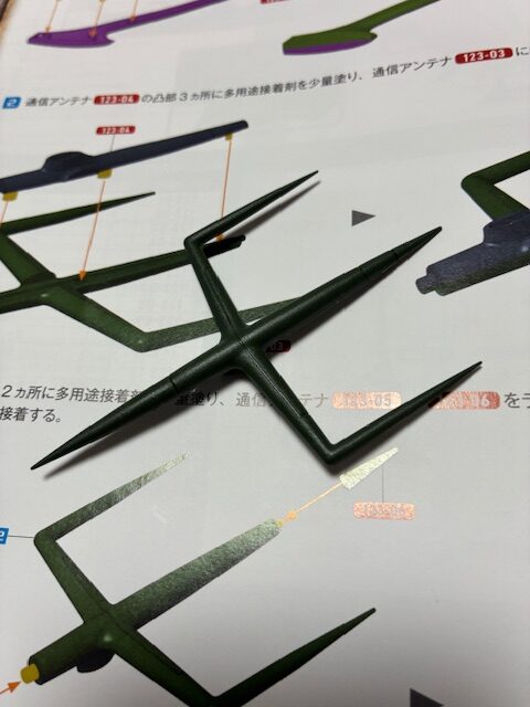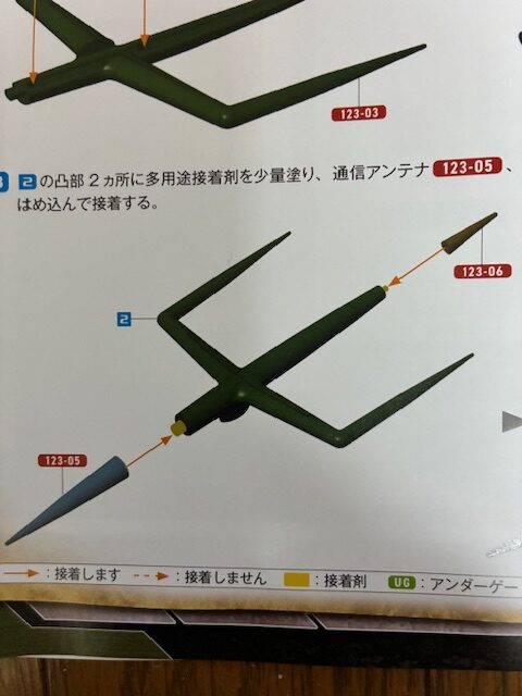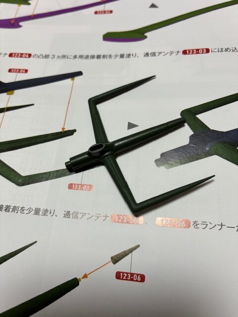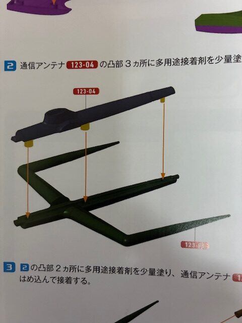 凸部2ヵ所を多用途接着剤を少量塗り、通信アンテナ123-05、123-06をランナーから切り離して図のようにそれぞれはめ込んで接着する。
