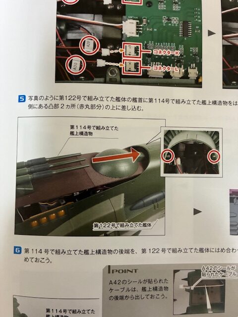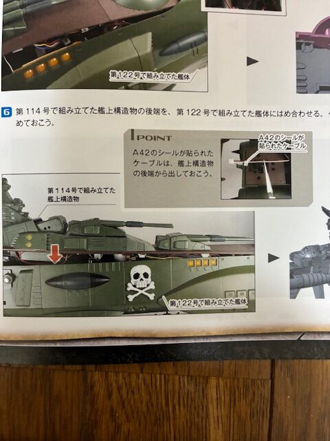 第114号で組み立てた艦上構造物の後端を、第122号で組み立てた艦体にはめ合わせる。ケーブルを挟まないように、事前にまとめておこう。