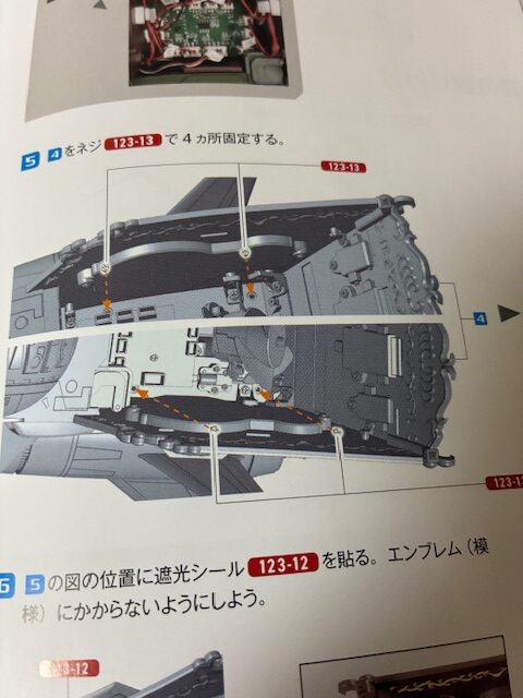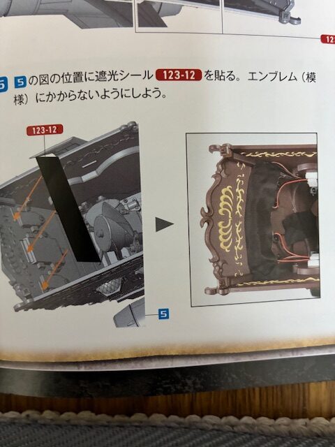 図の位置に遮光シール123-12を貼る。エンブレム(模様)にかからないようにしよう。