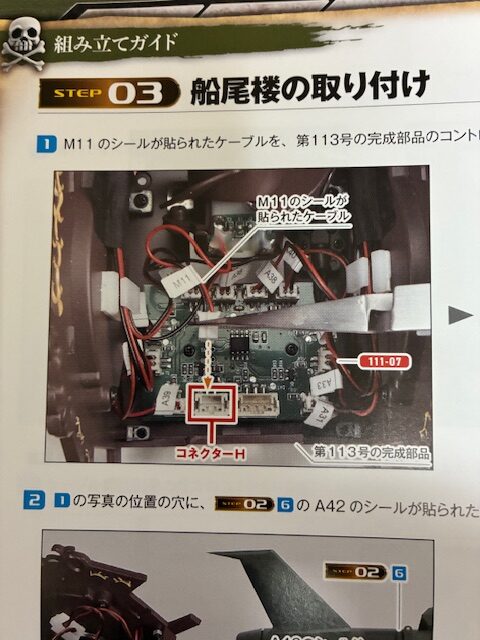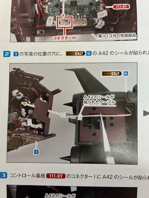 M11のシールが貼られたケーブルを、第113号の完成部品のコントロール基板111-07のコネクターHに接続する。