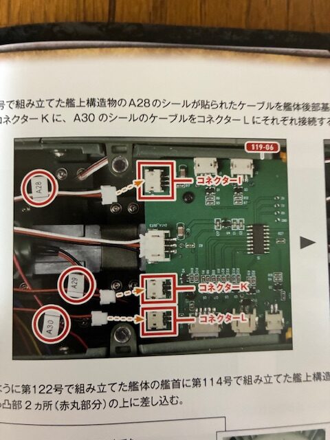 第114号で組み立てた艦上構造物のA28のシールが貼られたケーブルを艦体後部基板119-06のコネクターIに、A29のシールのケーブルをコネクターKに、A30のシールのケーブルLにそれぞれ接続する。