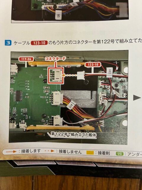 ケーブル123-10のもう片方のコネクターを第122号で組み立てた艦体の艦体後部基板119-06のコネクターFに接続する。