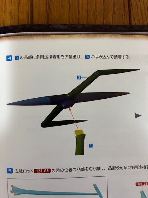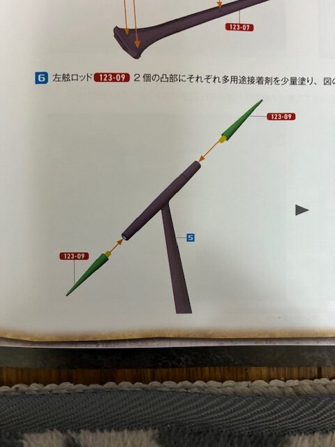 左舷ロッド123-09 2個の凸部にそれぞれ多用途接着剤を少量塗り、図のようにはめ込んで接着する。