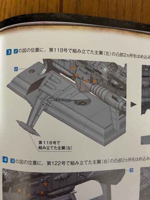 図の位置に、第118号で組み立てた主翼(左)の凸部2ヵ所をはめ込みながら、磁石2ヵ所を合わせる。