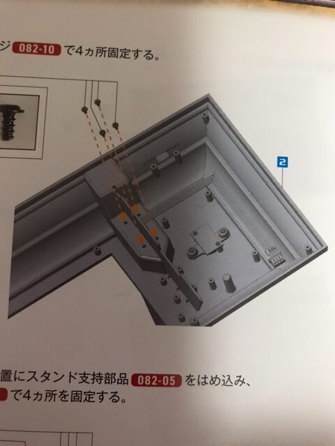 図の位置にスタンド支持部品082-05をはめ込み、ネジ082-11で4ヵ所を固定する。