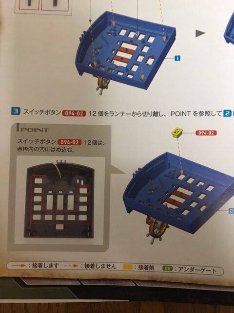 スイッチボタン094-02 12個をランナーから切り離し、POINTを参照してはめ込む。
