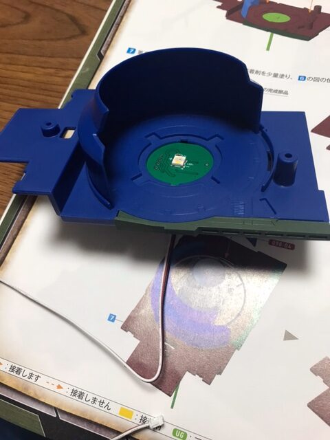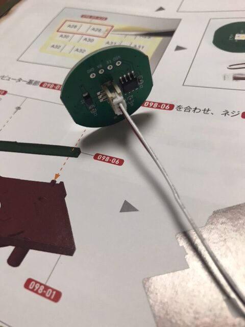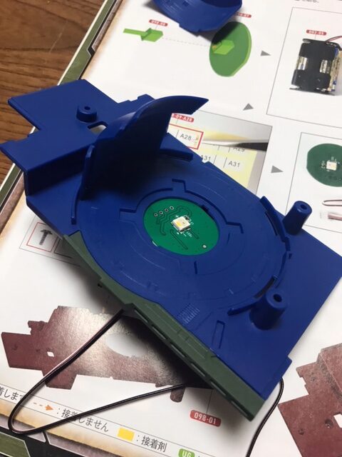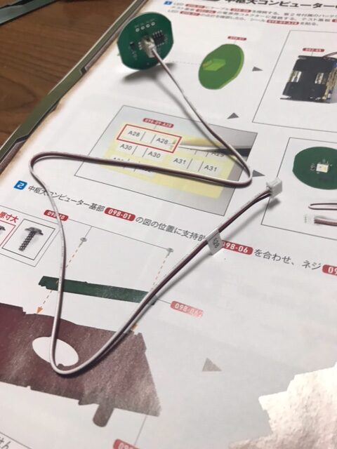 LED 098-07にケーブル098-08を接続する。第2号付属のバッテリーボックス002-05に単三乾電池4本を入れ、第2号付属のテスト基板002-06の電源用コネクターに接続する。テスト基板002-06の3ピンコネクターにケーブル098-08を接続してLED 098-07の点灯を確認したら、シール098-09-A28を貼る。